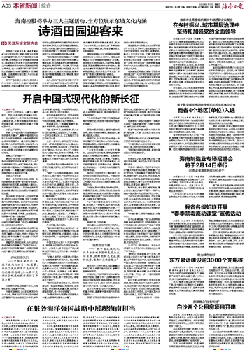 海洋强省是海南落实海洋强国战略的生动实践。紧紧围绕海南四大主导产业体系,高质量发展海洋经济,培育壮大海洋产业,着力构建具有核心竞争力的现代海洋产业体系;充分发挥资源和区位优势,积极打造深海研发聚集高地,不断提升海洋科技实力;紧盯突出问题,落实生态环保督察整改,全力抓好生态修复,持续开展“六水共治”,不断完善海洋生态环境监管体制机制,积极探索海洋生态环境保护管理新路径,守护好美丽海湾和美丽海洋……依海而生,向海图强,逐梦深蓝,海南激情谱写蓝色华章,推动万米深海探测从这里起航,水产种业“南繁硅谷”在这里加快形成,海洋强国建设在这里提速。
