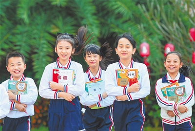 2月13日,我省各地中小学校将迎来春季学期开学。图为2月12日,在海口市港湾小学,学生们提前领取新书。