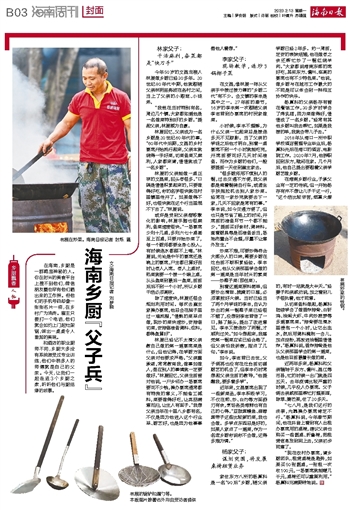 在文昌,像林展一样从父亲手中接过接力棒的“乡厨二代”有不少。会文镇的李丰是其中之一。27年前的春节,16岁的李丰第一次跟随父亲李志君到办宴席的村民家做菜。