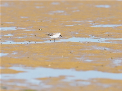 光村银滩的这只勺嘴鹬全身呈灰白色,时而在沙头上停歇两秒钟,时而在滩壑浅浅的水里,埋头觅食。