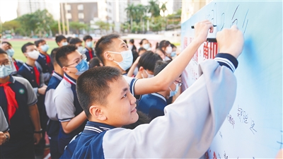 2月13日,海口市玉沙实验学校开展以“树理想·强本领·勇担当”为主题的2023年春季开学典礼,学生写下新学期寄语。 本报记者 张茂 摄