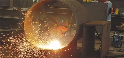 在华金钢构生产车间内,电焊工人在焊接筒形钢构件。 本报记者 林书喜 摄