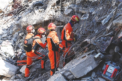 2月14日,在土耳其哈塔伊省安塔基亚市,中国救援队队员在地震废墟中搜救。