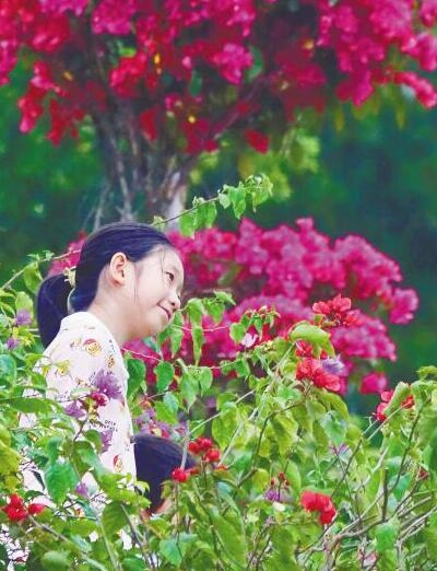 二月十七日,市民游客在海口三角梅公园的花海中游览。本报记者 张茂 实习生 李楷 摄
