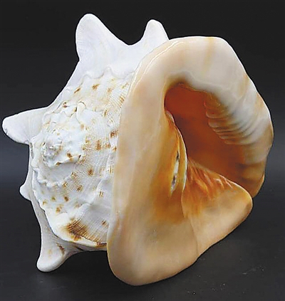 与螺塔低矮的唐冠螺相反,凤尾螺的螺塔又高又尖,花纹十分绚烂,像极了孔雀尾翼。只是过尖则易折,凤尾螺的螺顶常缺损,但人们发现这样一来,它反倒能吹出悠扬浑厚的号角声。于是,凤尾螺被古人视作神物,供奉于寺院和庙庵中,并多了个“法螺”的别称。