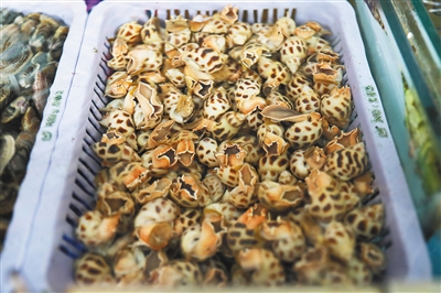 海口火车头万人海鲜广场销售的东风螺。 海南日报记者 李天平 摄