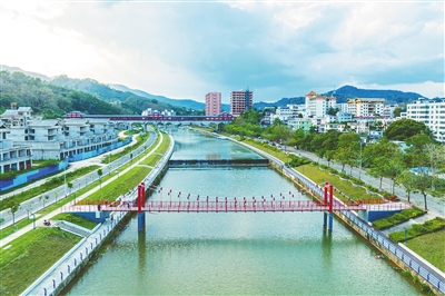 近日,俯瞰琼中黎族苗族自治县营根河两岸景观。近年来,琼中着力提升营根河的河岸景观,通过水质提升、河道整治、景观美化等举措,将营根河两岸打造成为市民游客休闲散步的好去处。
