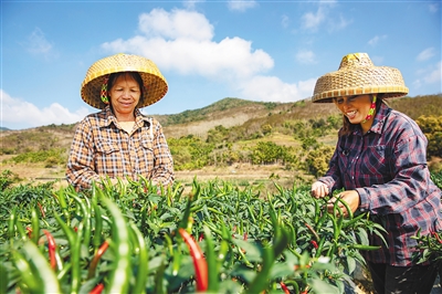 2月23日,在五指山市毛阳镇牙胡村,村民们忙着采摘辣椒。