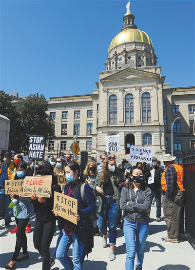 二○二一年三月二十日,人们手持标语在美国佐治亚州议会大厦前举行抗议针对亚裔暴力的集会。新华社发