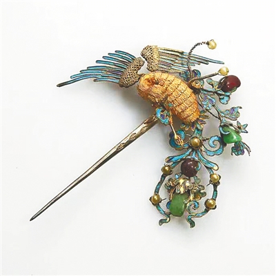 走进展厅,第一部分的展项以图版为主。寓意“吉利祥瑞”的银鎏金如意头发簪、富有“雍容富贵”气质的清末民初银鎏金发簪以及绚丽多彩的清代金银珠宝飞凤发簪等,都让人不禁感叹中国古典之美,更赞叹能工巧匠的技艺高超。