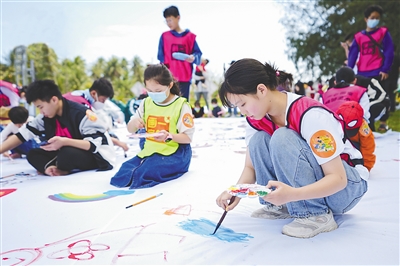 而在绿色田野上,是亲子家庭的涂鸦天地,主办方在田野上放置了两块长长的白布,和众多白色小帐篷,让小朋友们随意涂鸦,“消灭白布”。