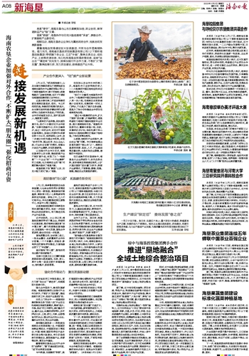 据了解,双方将在规划编制、项目实施、特色产业、制度集成创新等方面进行深度合作,推动琼中产业升级转型,解决垦区居民“报建难”“人地分离”、耕地“非农化”“非粮化”等问题,最大限度发挥全域土地综合整治项目效益。