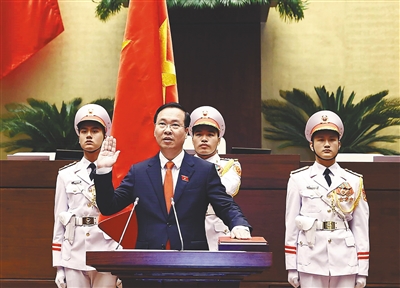据越南国家电视台2日报道,越南第十五届国会第四次特别会议当天上午在首都河内召开,经投票表决,越共中央政治局委员、中央书记处常务书记武文赏当选为越南国家主席,武文赏随后宣誓就职。新华社/越通社