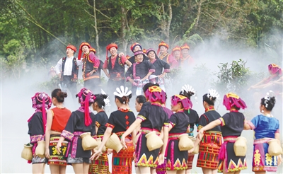 ② 在五指山市水满乡毛纳村,演员正身着民族服装表演。 本报记者 李天平 摄