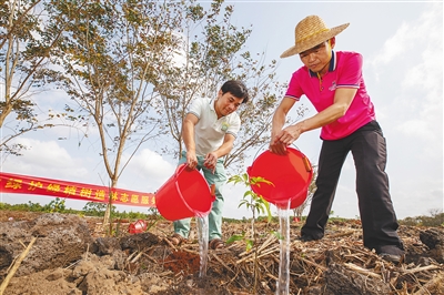 3月12日,在海口冯唐绿园的植树点,冯唐村的村民为树苗浇水。
