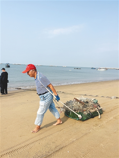 埋在沙滩下的废弃渔网,他用钉耙一点一点挖出来;看到废弃的玻璃瓶和贝壳,他掏出随身带的小铲刀跪在沙滩上抠出来;看到丢弃的死鱼烂虾,他戴上手套一个一个捡起来……