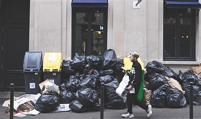 法国巴黎市政厅12日说,由于环卫工人罢工,巴黎街头堆放的垃圾数以千吨计,无人清理。