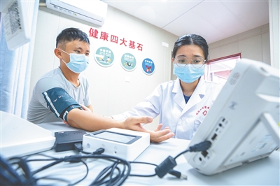 在琼海市博鳌镇沙美村卫生室的5G诊室,全科医生用“健康一体机”为村民检查身体状况。阮琛 摄