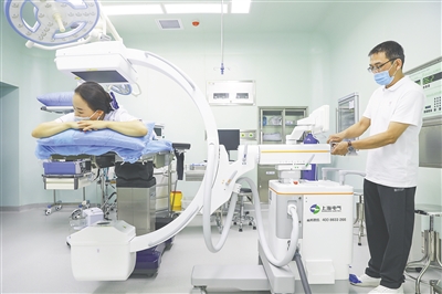 在屯昌县中医医院,医务人员试用刚购置的C臂机架,为后续的骨科手术操作做准备。方山 摄