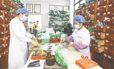 在澄迈永发镇中心卫生院,医务人员为患者配制中药。方山 摄