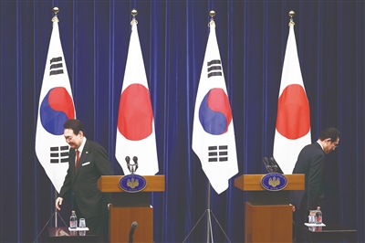 3月16日,在日本东京首相官邸,韩国总统尹锡悦(左)与日本首相岸田文雄(右)出席联合新闻发布会后各自走下讲台。新华社发