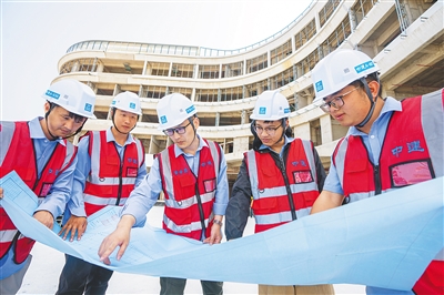 在博鳌乐城国际医疗旅游先行区内的树兰博鳌医院项目现场,建设者们在看施工图。 阮琛 摄