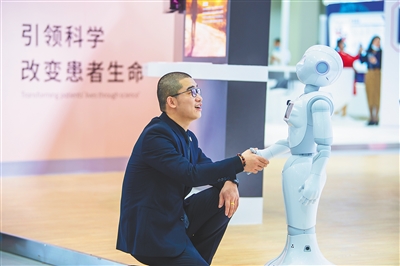 在博鳌乐城国际医疗旅游先行区国际创新药械转换中心,医生在和机器人互动。 阮琛 摄