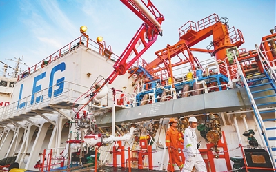 洋浦经济开发区海南炼化乙烯码头,工人在巡查满载3500吨乙烯产品的轮装船。