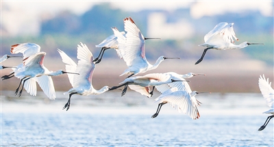 飞翔中的黑脸琵鹭。 本报记者 陈元才 摄
