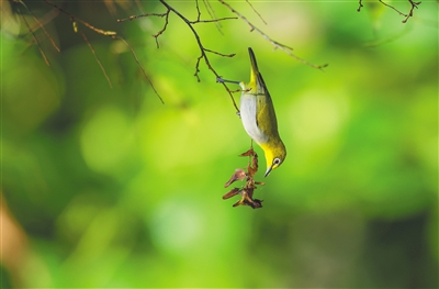 暗绿绣眼在海南热带雨林国家公园五指山片区觅食。本报记者 李天平 摄