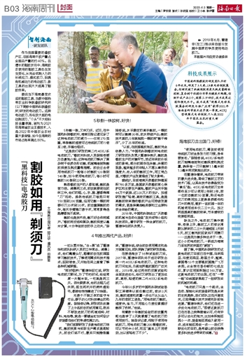 除此之外,电动胶刀操作简单、容易上手,割胶工人的培训周期从原来的二三十天缩短至3天到5天,胶工割完胶回家后不用磨刀……正是因为集多种优点于一身,这小小的电动胶刀,一跃成为海南乃至世界胶林里的“新宠”!