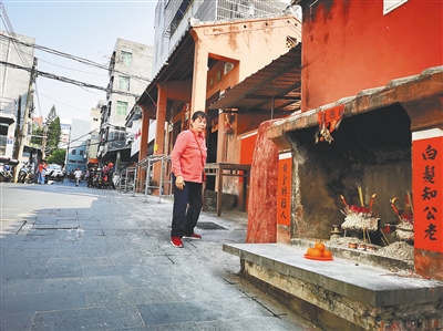 从府城中山北路和文庄路交叉口往东行走不到1公里,在琼山中学老校区大门口正对面可看见一块写着“尚书直街”四字的路牌,右拐进入就是尚书直街。往里走约50米,可以看到一座关帝庙。“这座关帝庙是鼓楼街上关帝庙的分庙,时代并不久远。”今年67岁的林进琼说,从出生至今她一直住在尚书直街。