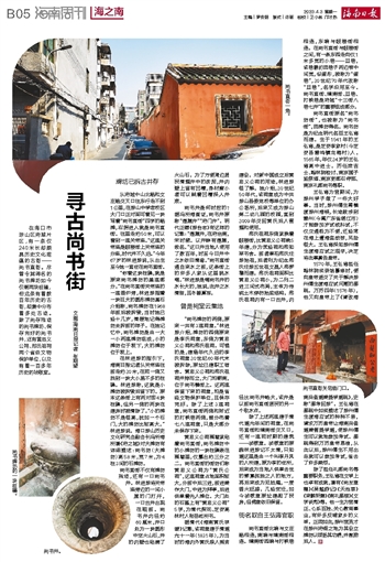 尚书井是何时挖的?据冯所海查证,尚书井原称“莲塘井”“府门井”。明代正德《琼台志》有这样的记载:“莲塘井,在府治南,宋时凿。以井畔有莲塘,故名。”这口井当地人使用了数百年,时至今日井中之水依旧清澈。“尚书直街通自来水之前,这条街上的许多人家从这里挑水喝。”林进琼是喝尚书井的水长大的,她说,此井之水清甜,且冬暖夏凉。