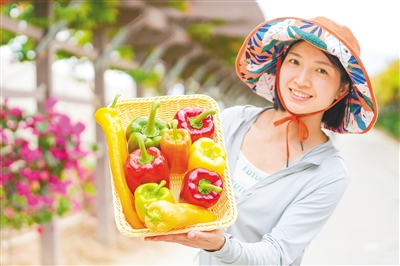 三亚市崖州区国家现代农业产业园,2023中国种子大会暨南繁硅谷论坛参展企业博收种业的工作人员展示培育的新品种辣椒。产业园项目由海垦南繁与三亚农投和崖州湾科技城共同建设。