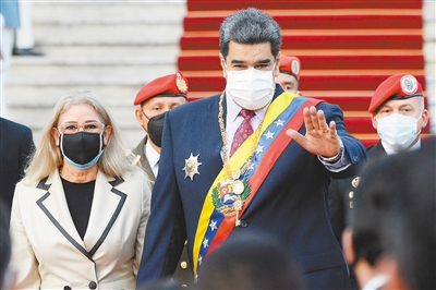 2022年1月15日,在委内瑞拉加拉加斯,委内瑞拉总统马杜罗(中)准备在全国代表大会发表年度演讲(资料照片)。新华社/法新