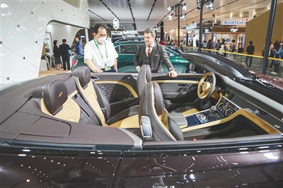 在海南国际会展中心5号展馆宾利展台,外籍嘉宾(右)向观众介绍参展车辆。 本报记者 王程龙 摄