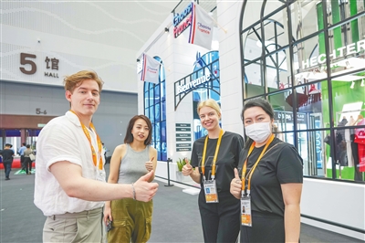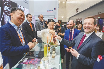 法国馆前,外籍嘉宾和观众一起为消博会点赞。本报记者 王程龙 摄