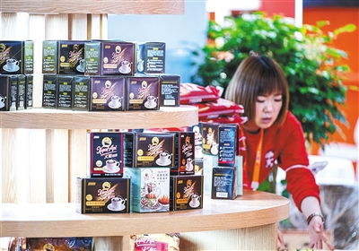 ② 在第三届消博会现场,印尼的火船咖啡展台。 本报记者 袁琛 摄