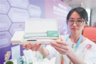 可持续消费论坛现场,工作人员展示一款利用再生塑料制成的圆珠笔。 本报记者 王程龙 摄