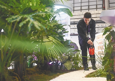工作人员为种植在消博会展台上的绿植浇水。 本组图片除署名外均由新华社发