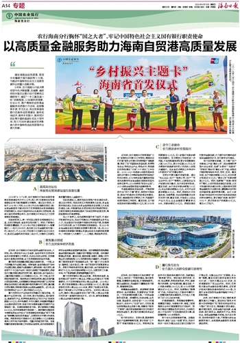 未来,农行海南分行将以推动高质量发展为工作重心,更加突出“服务乡村振兴的领军银行”和“服务实体经济的主力银行”两大定位,围绕重大项目建设、重点园区服务、自贸金融产品创新、全域旅游、现代服务业、高新技术产业、特色农业、绿色金融等重点领域,加大总分联动、投贷联动服务力度,不断强化综合金融服务能力,全面提高金融服务自贸港建设质效。