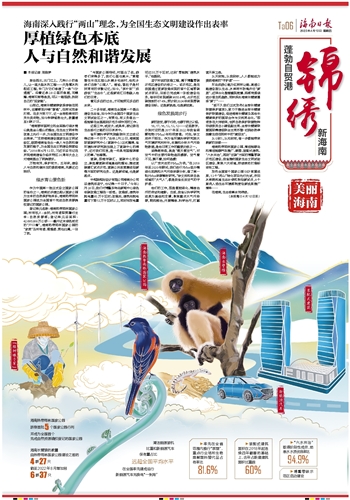 环岛旅游公路为红树林让路、高速公路建设服从生态、水库树木防淹乔迁“新居”、近岸白化珊瑚重现斑斓、西部荒漠绿进沙退生机盎然、雨林深处海南长臂猿喜添“新丁”……