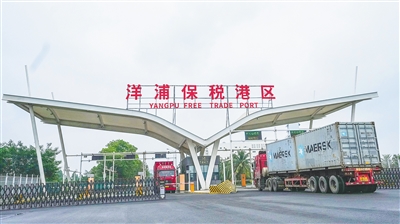 运输货物的车辆进出洋浦保税港区。本报记者 陈元才 摄