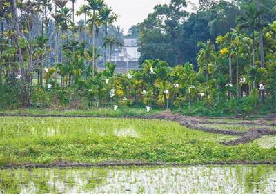 在琼海石壁镇大田陂村,绿树葱茏,碧水环绕,鹭鸟或翩翩起舞或在田地里休憩。本报记者 袁琛 摄