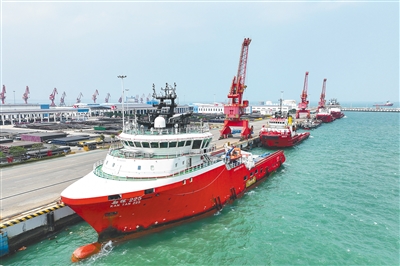 在海南中海石油码头有限公司码头,作业船进行补给作业。 本报记者 武威 摄