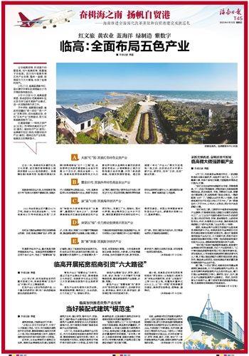 红黄蓝绿紫——特色文旅产业(红色)、热带特色高效农业产业(黄色)、海洋经济产业(蓝色)、金牌港开发区(绿色)和数字经济产业(紫色),围绕五色产业布局,临高走出发展新路子。