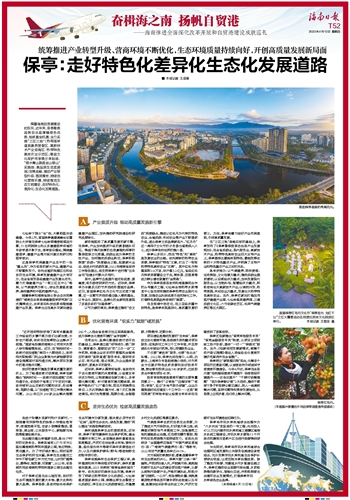 ■ 本报记者 王迎春乘着海南自贸港建设的东风,近年来,保亭黎族苗族自治县厚植绿色优势,抢抓黄金机遇,全力实施“三区三地”(热带雨林温泉康养度假区、高新技术产业培育区、热带特色高效农业示范区;黎苗文化保护传承展示体验地、“绿水青山就是金山银山”实践地、高品质生活宜居地)发展战略,推动产业转型升级、提质增效,持续优化营商环境,持续推进生态文明建设,走好特色化、差异化、生态化发展道路。