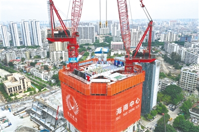 “空中造楼机”在自贸港海南中心项目投入使用。