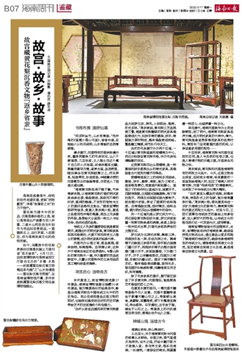 如今,深藏宫中的花梨家具和沉香雅玩踏上万里归途“返乡省亲”。4月13日,由故宫博物院与海南省旅文厅联合主办的“乡情·乡思——故宫藏黄花梨沉香文物精品系列展”之“山水有清音——黄花梨沉香书房展”,在海南省博物馆开幕,多件故宫院藏黄花梨沉香文物在省博物馆展出。