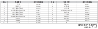 按照《地表水环境质量标准》(GB3838-2002)、《地表水环境质量评价办法(试行)》(环办〔2011〕22号)和《城市地表水环境质量排名技术规定(试行)》(环办监测〔2017〕51号)等评价,2023年3月,全省地表水总体水质为优,监测的191个断面(点位)中:水质优良(Ⅰ~Ⅲ类)断面(点位)占94.8%,劣V类占0.5%。19个市县水环境质量按由好至差排名分别为:三沙市、五指山市、昌江黎族自治县、琼中黎族苗族自治县、白沙黎族自治县、陵水黎族自治县、保亭黎族苗族自治县、澄迈县、琼海市、万宁市、海口市、定安县、屯昌县、乐东黎族自治县、临高县、三亚市、儋州市、东方市、文昌市。详见右表: